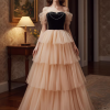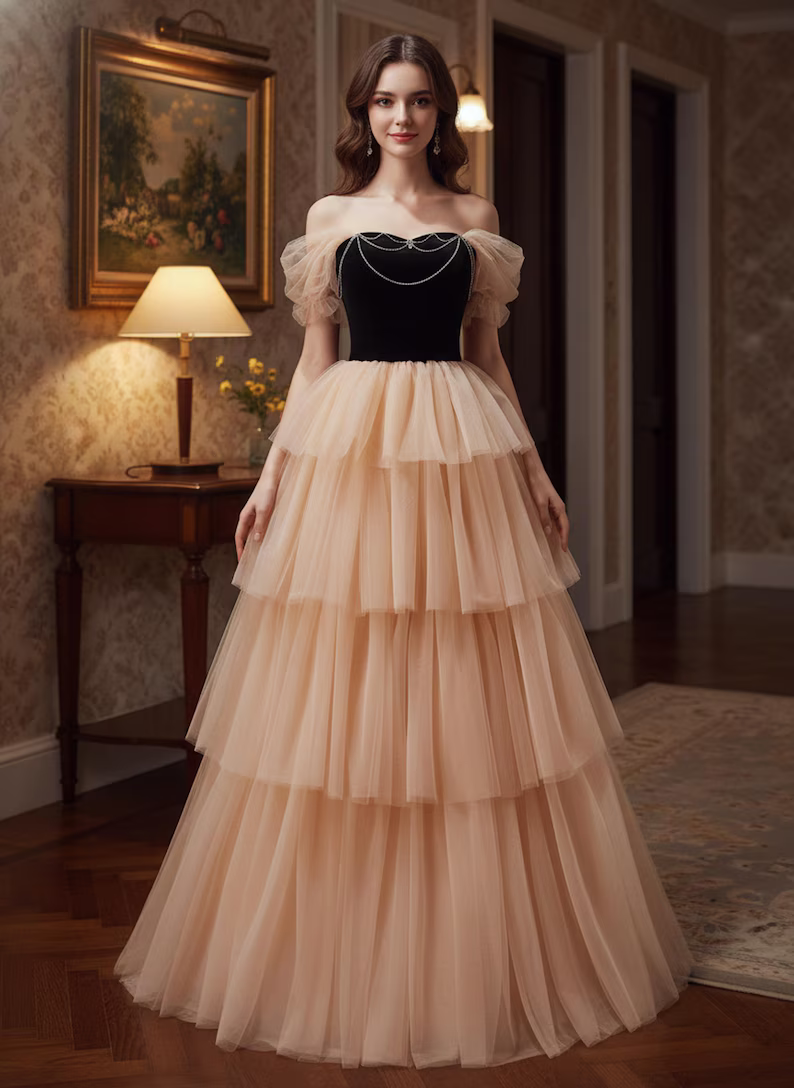 Be the first to review “Black Velvet and Champagne Tulle Prom Dress,Tiered Ruffle Ball Gown” Cancel reply